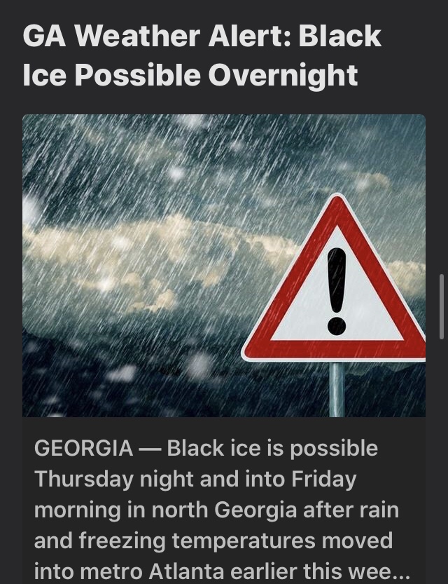 Y’all be safe and Stay warm in this crazy weather . We all already know Georgia people don’t know how to drive right . Even know you may beable to drive doesn’t mean the ones around you can .