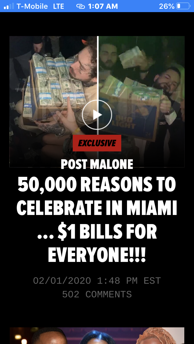 Post Malone $50K Single Dollar Bills www.tmz.com/2020/02/01/post-malone-50k-single-dollar-bills-ultraclub-e11even-miami-club
